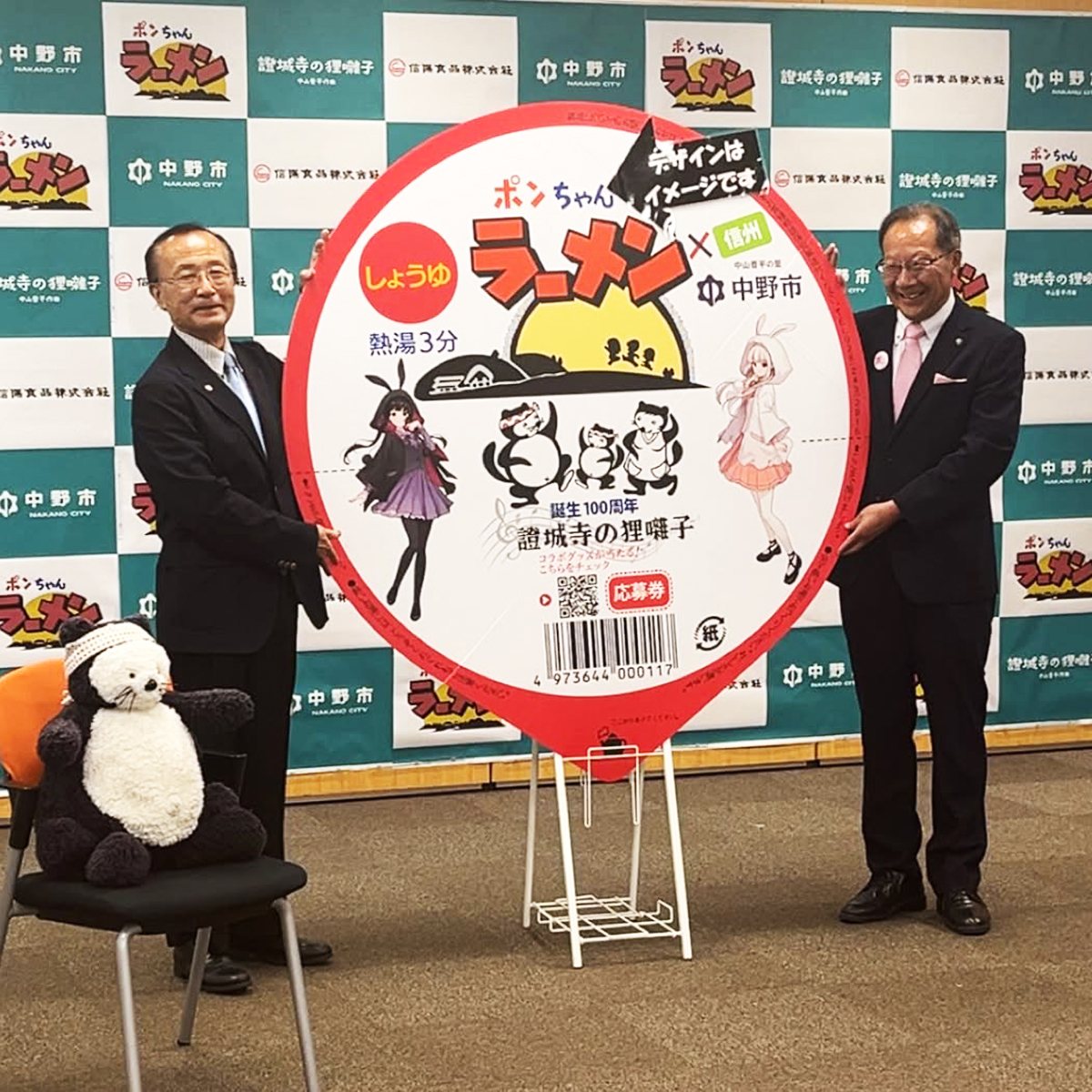 「ポンちゃんラーメン限定パッケージ」は10月から5万個限定で、中野市内の記念館やホテル、県内のスーパー、コンビニエンスストアなどで販売される予定です。